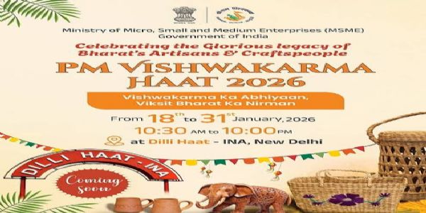 নয়াদিল্লি, ১৭ জানুয়ারি (হি স.) : আগামী ১৮ থেকে ৩১ জানুয়ারি পর্যন্ত নয়াদিল্লির আইএনএ-স্থিত বিখ্যাত ‘দিল্লি হাট’-এ আয়োজিত হতে চলেছে ‘পিএম বিশ্বকর্মা হাট-২০২৬’। রবিবার, ১৮ জানুয়ারি এই প্রদর্শনীর আনুষ্ঠানিক উদ্বোধন করবেন কেন্দ্রীয় ক্ষুদ্র, কুটির ও মাঝ