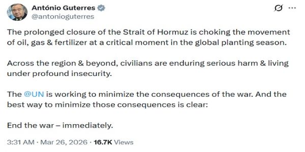 নিউইয়র্ক, ২৬ মার্চ (হি.স.): পশ্চিম এশিয়া সংঘাত ও যুদ্ধের পরিস্থিতি নিয়ে উদ্বিগ্ন রাষ্ট্রসঙ্ঘ। হরমুজ প্রণালী বন্ধ নিয়েও উদ্বেগ প্রকাশ করা হয়েছে। রাষ্ট্রসংঘের মহাসচিব আন্তোনিও গুতেরেস জানিয়েছেন, যুদ্ধের পরিণতি হ্রাস করার জন্য কাজ করছে রাষ্ট্রসঙ্ঘ। এক